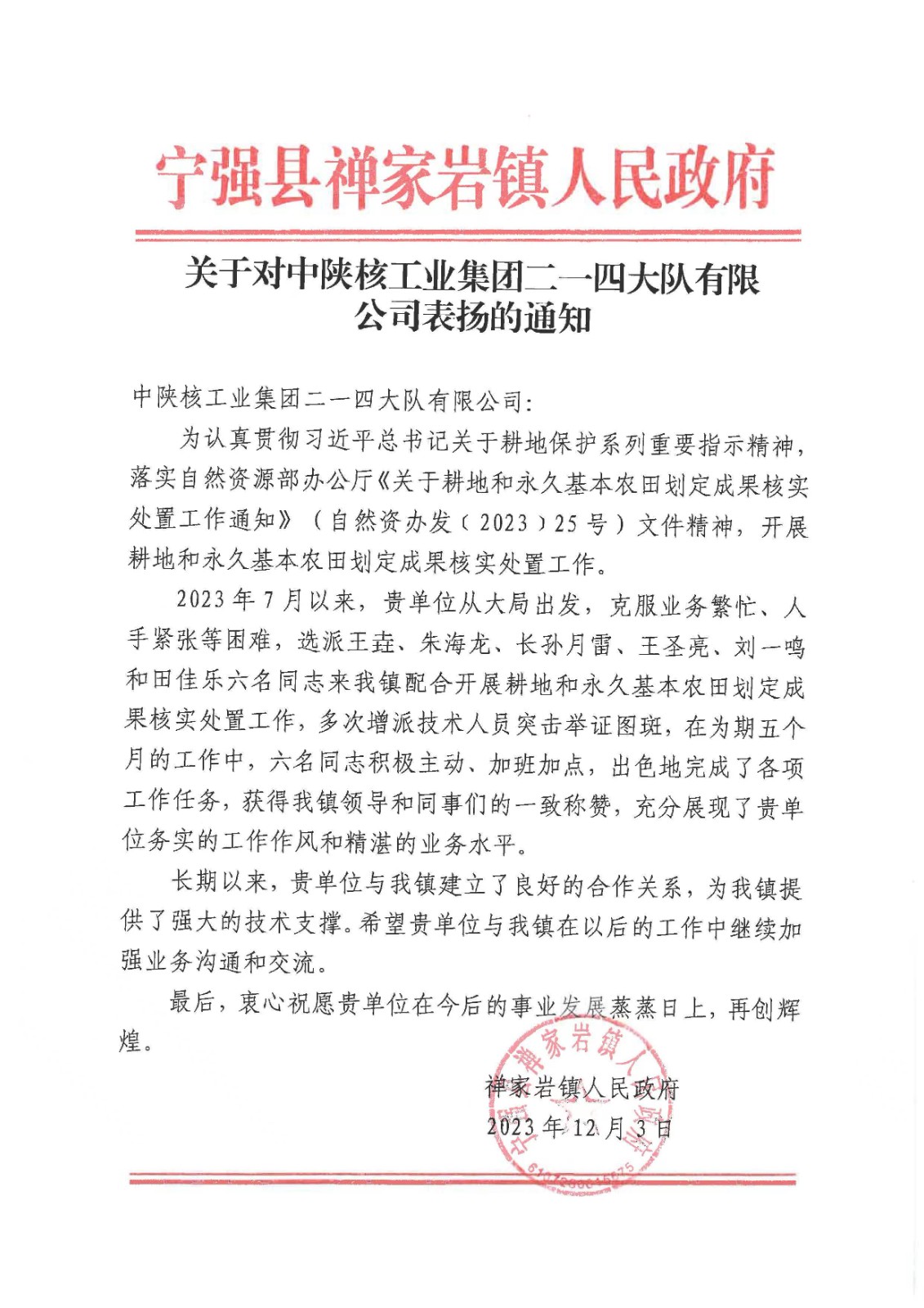 該通知是由漢中市寧強縣禪家巖鎮人民政府發布,主要是對我公司2023年7月以來,從大局出發,克服業務繁忙、人手緊張等困難,選派王垚、朱海龍、長孫月雷、王圣亮、劉一鳴和田佳樂六名同志配合禪家巖鎮開展耕地和永久基本農田劃定成果核實處置工作,多次增派技術人員突擊舉證圖斑,在為期五個月的工作中,六名同志積極主動、加班加點,出色地完成了各項工作任務表示稱贊,同時對公司一線技術人員務實的工作作風和精湛的業務水平表示肯定。