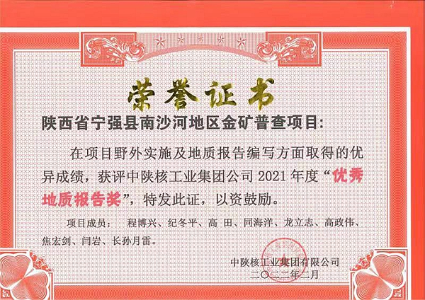 近日,公司地質調查院負責實施的“陜西省寧強縣南沙河地區金礦普查”項目成果報告獲中陜核工業集團有限公司2021年度“優秀成果報告獎”。